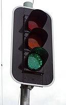 Green can communicate safety to proceed, as in traffic lights.[61] Green and red were standardized as the colors of international railroad signals in the 19th century.[62] The first traffic light, using green and red gas lamps, was erected in 1868 in front of the Houses of Parliament in London. It exploded the following year, injuring the policeman who operated it. In 1912, the first modern electric traffic lights were put up in Salt Lake City, Utah. Red was chosen largely because of its high visibility, and its association with danger, while green was chosen largely because it could not be mistaken for red. Today green lights universally signal that a system is turned on and working as it should. In many video games, green signifies both health and completed objectives, opposite red.