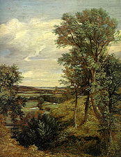 Dedham Vale (1802) by John Constable. The paintings of Constable romanticized the vivid green landscapes of England