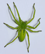 The green huntsman spider is green due to the presence of bilin pigments in the spider's hemolymph (circulatory system fluids) and tissue fluids.[43] It hunts insects in green vegetation, where it is well camouflaged.
