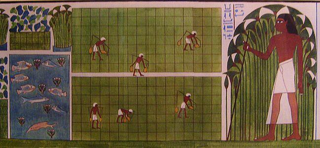 In Ancient Egypt, green was the symbol of regeneration and rebirth, and of the crops made possible by the annual flooding of the Nile. For painting on the walls of tombs or on papyrus, Egyptian artists used finely ground malachite, mined in the west Sinai and the eastern desert; a paintbox with malachite pigment was found inside the tomb of King Tutankhamun. They also used less expensive green earth pigment, or mixed yellow ochre and blue azurite. To dye fabrics green, they first colored them yellow with dye made from saffron and then soaked them in blue dye from the roots of the woad plant.[51]