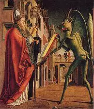 In the 15th century Saint Wolfgang and the Devil by Michael Pacher, the Devil is green. Poets such as Chaucer also drew connections between the color green and the devil.[56]