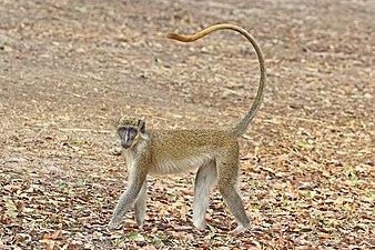 The green monkey (Chlorocebus sabaeus), also known as the sabaeus monkey or the callithrix monkey,[3] is an Old World monkey with golden-green fur and pale hands and feet.[4] The tip of the tail is golden yellow as are the backs of the thighs and cheek whiskers.[4] It does not have a distinguishing band of fur on the brow, like other Chlorocebus species, and males have a pale blue scrotum.[4] Some authorities consider this and all of the members of the genus Chlorocebus to be a single widespread species, Chlorocebus aethiops.