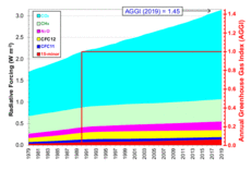 The Annual Greenhouse Gas Index (AGGI) is defined by atmospheric scientists at NOAA as the ratio of total direct radiative forcing due to long-lived and well-mixed greenhouse gases for any year for which adequate global measurements exist, to that present in year 1990.[40][43] These radiative forcing levels are relative to those present in year 1750 (i.e. prior to the start of the industrial era). 1990 is chosen because it is the baseline year for the Kyoto Protocol, and is the publication year of the first IPCC Scientific Assessment of Climate Change. As such, NOAA states that the AGGI "measures the commitment that (global) society has already made to living in a changing climate. It is based on the highest quality atmospheric observations from sites around the world. Its uncertainty is very low."[44]