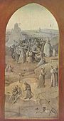 Grisaille (/ɡrɪˈzaɪ/ or /ɡrɪˈzeɪl/; French: gris [ɡʁizaj] 'grey') is a painting executed entirely in shades of grey or of another neutral greyish colour.[1] It is particularly used in large decorative schemes in imitation of sculpture. Many grisailles include a slightly wider colour range, like the Andrea del Sarto fresco illustrated. Paintings executed in brown are referred to as brunaille, and paintings executed in green are called verdaille.[2]