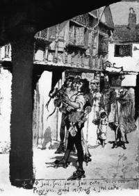 At least as far back as the 15th century, among Christians, there had been a custom of sharing soul-cakes at Allhallowtide (October 31 through November 2).[12][13] People would visit houses and take soul-cakes, either as representatives of the dead, or in return for praying for their souls.[14] Later, people went "from parish to parish at Halloween, begging soul-cakes by singing under the windows some such verse as this: 'Soul, souls, for a soul-cake; Pray you good mistress, a soul-cake!'"[15] They typically asked for "mercy on all Christian souls for a soul-cake".[16] It was known as 'Souling' and was recorded in parts of Britain, Flanders, southern Germany, and Austria.[17] Shakespeare mentions the practice in his comedy The Two Gentlemen of Verona (1593), when Speed accuses his master of "puling [whimpering or whining] like a beggar at Hallowmas".[18]