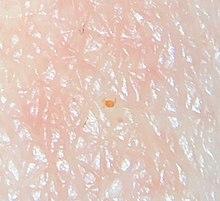 Trombiculidae live in forests and grasslands and are also found in the vegetation of low, damp areas such as woodlands, berry bushes, orchards, along lakes and streams, and even in drier places where vegetation is low, such as lawns, golf courses, and parks.[8] They are most numerous in early summer when grass, weeds, and other vegetation are heaviest. In their larval stage, they attach to various animals, including humans, and feed on skin, often causing itching. These relatives of ticks are nearly microscopic, measuring 0.4 mm (1/60 of an inch) and have a chrome-orange hue.[9][10] There is a marked constriction in the front part of the body in the nymph and adult stages. The best known species of chigger in North America[11] is the hard-biting Trombicula alfreddugesi of the Southeastern United States, humid Midwest[12] and Mexico; in the UK, the most prevalent chigger, called the "harvest mite", is Trombicula autumnalis, with distribution through Western Europe to Eastern Asia.[13]