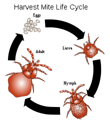 The length of the mite's cycle depends on species and environment, but normally lasts two to 12 months. The number of cycles in a year depends on the region. For example, in a temperate region, only three per year may occur, but in tropical regions, the cycle might be continuous all year long.[14] Adult harvest mites winter in protected places such as slightly below the soil surface. Females become active in the spring, and once the ground temperature is regularly above 60 °F (16 °C), they lay eggs in vegetation, up to 15 eggs per day. The eggs are round and are dormant for about six days, after which the nonfeeding prelarvae emerge, with only three pairs of legs. After about six days, the prelarvae grow into their larval stage.[14]
