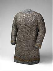 A hauberk or byrnie is a shirt of mail. The term is usually used to describe a shirt reaching at least to mid-thigh and including sleeves.[1] Haubergeon ("little hauberk") generally refers to the quilted undergarment used with a hauberk, but the terms are sometimes used interchangeably.[1]
