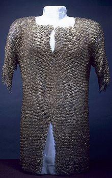 A Hauberk was typically constructed from interlocking loops of metal to form a mail shirt. The sleeves sometimes only went to the elbow, but often were full arm length, with some covering the hands with a supple glove leather face on the palm of the hand, or even full mail gloves. It was usually thigh or knee length, with a split in the front and back to the groin so the wearer could ride a horse. It sometimes incorporated a hood, or coif. Per historian Kelly DeVries "the hauberk was probably worn over, but not attached to, a heavy, quilted undergarment, the haubergeon."[1]
