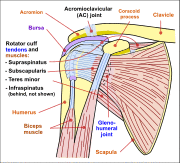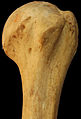 The head (caput humeri), is nearly hemispherical in form. It is directed upward, medialward, and a little backward, and articulates with the glenoid cavity of the scapula to form the glenohumeral joint (shoulder joint). The circumference of its articular surface is slightly constricted and is termed the anatomical neck, in contradistinction to a constriction below the tubercles called the surgical neck which is frequently the seat of fracture. Fracture of the anatomical neck rarely occurs.[2] The diameter of the humeral head is generally larger in men than in women.