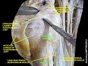 The tubercles are separated from each other by a deep groove, the bicipital groove (intertubercular groove; bicipital sulcus), which lodges the long tendon of the biceps brachii muscle and transmits a branch of the anterior humeral circumflex artery to the shoulder-joint. It runs obliquely downward, and ends near the junction of the upper with the middle third of the bone. In the fresh state its upper part is covered with a thin layer of cartilage, lined by a prolongation of the synovial membrane of the shoulder-joint; its lower portion gives insertion to the tendon of the latissimus dorsi muscle. It is deep and narrow above, and becomes shallow and a little broader as it descends. Its lips are called, respectively, the crests of the greater and lesser tubercles (bicipital ridges), and form the upper parts of the anterior and medial borders of the body of the bone.[2]