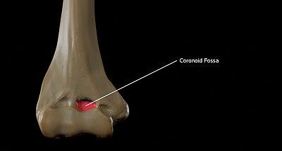 The coronoid fossa is the medial hollow part on the anterior surface of the distal humerus. The coronoid fossa is smaller than the olecranon fossa and receives the coronoid process of the ulna during maximum flexion of the elbow.