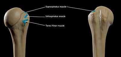 The greater tubercle is just lateral to the anatomical neck. Its upper surface is rounded and marked by three flat impressions: the highest of these gives insertion to the supraspinatus muscle; the middle to the infraspinatus muscle; the lowest one, and the body of the bone for about 2.5 cm. below it, to the teres minor muscle. The lateral surface of the greater tubercle is convex, rough, and continuous with the lateral surface of the body.[2]