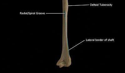 The radial sulcus, also known as the spiral groove is found on the posterior surface of the shaft and is a shallow oblique groove through which the radial nerve passes along with deep vessels. This is located posteroinferior to the deltoid tuberosity. The inferior boundary of the spiral groove is continuous distally with the lateral border of the shaft.