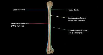 - Anterior: the anterior border runs from the front of the greater tubercle above to the coronoid fossa below, separating the antero-medial from the antero-lateral surface. Its upper part is a prominent ridge, the crest of the greater tubercle; it serves for the insertion of the tendon of the pectoralis major muscle. About its center it forms the anterior boundary of the deltoid tuberosity, on which the deltoid muscle attaches; below, it is smooth and rounded, affording attachment to the brachialis muscle.