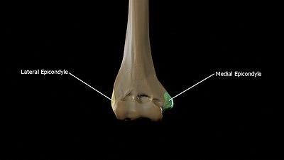 The distal or lower extremity of the humerus is flattened from before backward, and curved slightly forward; it ends below in a broad, articular surface, which is divided into two parts by a slight ridge. Projecting on either side are the lateral and medial epicondyles.
