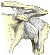 The deltoid originates on the lateral third of the clavicle, acromion and the crest of the spine of the scapula. It is inserted on the deltoid tuberosity of the humerus and has several actions including abduction, extension, and circumduction of the shoulder. The supraspinatus also originates on the spine of the scapula. It inserts on the greater tubercle of the humerus, and assists in abduction of the shoulder.