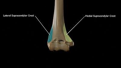 The Medial supracondylar crest forms the sharp medial border of the distal humerus continuing superiorly from the medial epicondyle. The Lateral Supracondylar crest forms the sharp lateral border of the distal humerus continuing superiorly from the lateral epicondyle.[3]