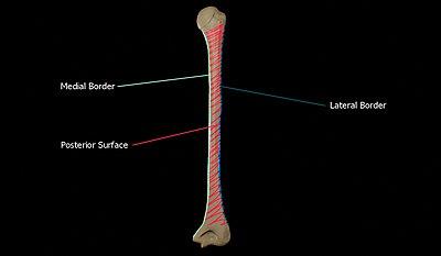 - Posterior surface: the area between the medial and lateral borders. The posterior surface appears somewhat twisted, so that its upper part is directed a little medialward, its lower part backward and a little lateralward. Nearly the whole of this surface is covered by the lateral and medial heads of the Triceps brachii, the former arising above, the latter below the radial sulcus.