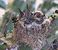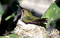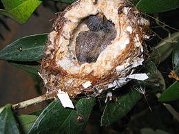 Many hummingbird species use spider silk and lichen to bind the nest material together and secure the structure.[58][60] The unique properties of the silk allow the nest to expand as the young hummingbirds grow.[58][59] Two white eggs are laid,[58][60] which despite being the smallest of all bird eggs, are in fact large relative to the adult hummingbird's size.[59] Incubation lasts 14 to 23 days,[60] depending on the species, ambient temperature, and female attentiveness to the nest.[57] The mother feeds her nestlings on small arthropods and nectar by inserting her bill into the open mouth of a nestling, and then regurgitating the food into its crop.[57][59]