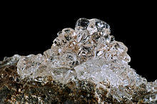 Hyalite's Mohs hardness is 5.5 to 6 and has a specific gravity of 1.9 - 2.1. It has no planes of cleavage but fractures conchoidally, is clear or translucent and has a globular structure. Its luster is vitreous and its streak is white. Hyalite is an amorphous form of silica (SiO2) formed as a volcanic sublimate in volcanic or pegmatic rock and is therefore considered a mineraloid. It contains 3 - 8% water, either as a silanol group or in molecular form.