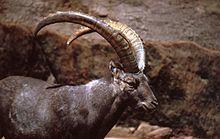 An ibex (plural ibex, ibexes or ibices) is any of several species of wild mountain goat (genus Capra), distinguished by the male's large recurved horns, which are transversely ridged in front. Ibex are found in Eurasia, North Africa, and East Africa. The name ibex comes from Latin, borrowed from Iberian or Aquitanian, akin to Old Spanish bezerro "bull", modern Spanish becerro "yearling". Ranging in height from 27 to 43 inches (0.69 to 1.09 m) and weighing 200 to 270 pounds (91 to 120 kg), ibex can live 20 years. Two closely related varieties of goats found in the wild are not usually called ibex: the markhor and the feral goat.