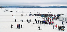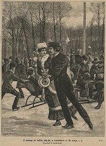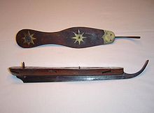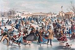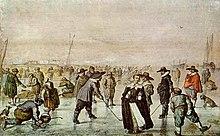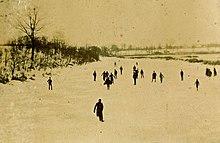 Skating became popular as a recreation, a means of transport and spectator sport in The Fens in England for people from all walks of life. Racing was the preserve of workers, most of them agricultural labourers. It is not known when the first skating matches were held, but by the early nineteenth century racing was well established and the results of matches were reported in the press.[8] Skating as a sport developed on the lakes of Scotland and the canals of the Netherlands. In the 13th and 14th centuries wood was substituted for bone in skate blades, and in 1572 the first iron skates were manufactured.[9] When the waters froze, skating matches were held in towns and villages all over the Fens. In these local matches men (or sometimes women or children) would compete for prizes of money, clothing or food.[10]