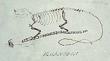 In recognition of the resemblance of the teeth to those of the iguana, Mantell decided to name his new animal Iguanodon or 'iguana-tooth', from iguana and the Greek word ὀδών (odon, odontos or 'tooth').[11] Based on isometric scaling, he estimated that the creature might have been up to 18 metres (59 feet) long, more than the 12-metre (39 ft) length of Megalosaurus.[1] His initial idea for a name was Iguana-saurus ('Iguana lizard'), but his friend William Daniel Conybeare suggested that that name was more applicable to the iguana itself, so a better name would be Iguanoides ('Iguana-like') or Iguanodon.[9][12] He neglected to add a specific name to form a proper binomial, but one was supplied in 1829 by Friedrich Holl: I. anglicum, which was later amended to I. anglicus.[13]