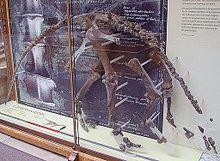 The largest find of Iguanodon remains to that date occurred on 28 February 1878 in a coal mine at Bernissart in Belgium, at a depth of 322 m (1,056 ft),[27] when two mineworkers, Jules Créteur and Alphonse Blanchard, accidentally hit on a skeleton that they initially took for petrified wood. With the encouragement of Alphonse Briart, supervisor of mines at nearby Morlanwelz, Louis de Pauw on 15 May 1878 started to excavate the skeletons and in 1882 Louis Dollo reconstructed them. At least 38 Iguanodon individuals were uncovered,[28] most of which were adults.[29] In 1882, the holotype specimen of I. bernissartensis became one of the first ever dinosaur skeletons mounted for display. It was put together in a chapel at the Palace of Charles of Lorraine using a series of adjustable ropes attached to scaffolding so that a lifelike pose could be achieved during the mounting process.[17] This specimen, along with several others, first opened for public viewing in an inner courtyard of the palace in July 1883. In 1891 they were moved to the Royal Museum of Natural History, where they are still on display; nine are displayed as standing mounts, and nineteen more are still in the Museum's basement.[27] The exhibit makes an impressive display in the Royal Belgian Institute of Natural Sciences, in Brussels. A replica of one of these is on display at the Oxford University Museum of Natural History and at the Sedgwick Museum in Cambridge. Most of the remains were referred to a new species, I. bernissartensis,[30] a larger and much more robust animal than the English remains had yet revealed. One specimen, IRSNB 1551, was at first referred to the nebulous, gracile I. mantelli, but is currently referred to Mantellisaurus atherfieldensis. The skeletons were some of the first complete dinosaur skeletons known. Found with the dinosaur skeletons were the remains of plants, fish, and other reptiles,[27] including the crocodyliform Bernissartia.[31]