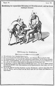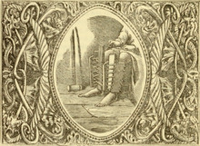 Primitive forerunners of the archetype can be found dating back as far as a thousand years. The first Scottish effort, also referred to as a buskin, made use of a vaguely boot-shaped rawhide garment that was soaked with water, drawn over the foot and lower leg, and bound in place with cords. The contraption was slowly heated over a gentle fire, drastically contracting the rawhide and squeezing the foot until the bones were dislocated, though there would not have been sufficient pressure to actually crush the bones of the foot. A more progressive variant, found in both the British Isles and France, consisted of a trio of upright wooden boards that splinted around and between the feet, fundamentally identical to the Chinese foot torture known as kia quen, and were tied in place by cords. Wedges were hammered between the boards and the feet to dislocate and crush the bones. Even ancient India saw the use of the kittee, a simplistic wooden press for squeezing feet.[4] A prototype hailing from Autun, France, consisted of high boots of spongy, porous leather that were drawn over the feet and legs. Boiling water was poured over the boots, eventually soaking through the leather and eating the flesh away from the entrapped limbs. Lastly, oversized boots of iron or copper (often soldered in place on the floor) received the prisoner's bare feet as he lay helplessly bound and gagged in a chair. The boots were slowly filled with boiling water or oil, or even molten lead, to consume the feet and legs. One variant—applied in Ireland to the martyr Dermot O'Hurley—consisted of lightweight metal boots that were filled with cool water and heated with the feet inside over a fire until the water boiled aggressively.