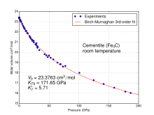 A natural iron carbide (containing minor amounts of nickel and cobalt) occurs in iron meteorites and is called cohenite after the German mineralogist Emil Cohen, who first described it.[7] As carbon is one of the possible minor light alloy components of metallic planetary cores, the high-pressure/high-temperature properties of cementite (Fe3C) as a simple proxy for cohenite are studied experimentally. The figure shows the compressional behaviour at room temperature.