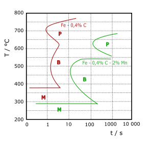 Time-Temperature-Transformation diagram for two steels: one with 0.4% wt. C (red line) and one with 0.4% wt. C and 2% weight Mn (green line). P = pearlite, B = bainite and M = martensite.