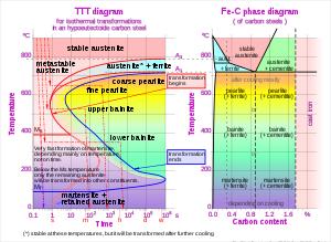 Isothermal transformation diagrams (also known as time-temperature-transformation (TTT) diagrams) are plots of temperature versus time (usually on a logarithmic scale). They are generated from percentage transformation-vs time measurements, and are useful for understanding the transformations of an alloy steel at elevated temperatures.
