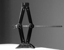 A screw jack consists of a heavy-duty vertical screw with a load table mounted on its top, which screws into a threaded hole in a stationary support frame with a wide base resting on the ground. A rotating collar on the head of the screw has holes into which the handle, a metal bar, fits. When the handle is turned clockwise, the screw moves further out of the base, lifting the load resting on the load table. In order to support large load forces, the screw is usually formed with Acme threads.