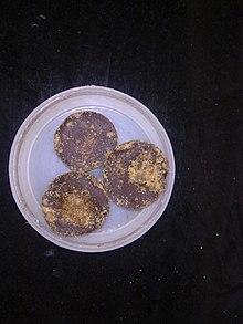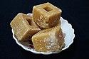 Jaggery is a traditional non-centrifugal cane sugar[1] mainly consumed in the Indosphere.[2] It is a concentrated product of cane juice and often date or palm sap without separation of the molasses and crystals, and can vary from golden brown to dark brown in colour, and is similar to the Latin American panela.[2] It contains up to 50% sucrose, up to 20% invert sugars, and up to 20% moisture, with the remainder made up of other insoluble matter, such as wood ash, proteins, and bagasse fibres.[2]