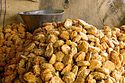 This hot liquid is golden. It is stirred continuously and lifted with a spatula to observe whether it forms a thread or drips while falling. If it forms many threads, it has completely thickened. It is poured into a shallow flat-bottomed pan to cool and solidify. The pan is extremely large to allow only a thin coat of this hot liquid to form at its bottom, so as to increase the surface area for quick evaporation and cooling. After cooling, the jaggery becomes a soft solid that is molded into the desired shape. The quality of jaggery is judged by its colour; brown means it is higher in impurities and golden-yellow implies it is relatively pure. Due to this grading scale, coloured adulterants are sometimes added to jaggery to simulate the golden hue.