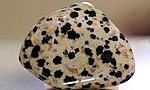 "Dalmatian jasper" - not a jasper at all but a form of the igneous rock Perthite. The black spots are composed of the rare amphibole arfvedsonite (and not, as often claimed, of tourmaline). Polished pebble.