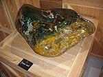 Green-yellow-and-orange polished jasper boulder, Tropical Parc, musée des mineraux, Saint-Jacut-les-Pins, Brittany