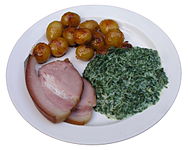 In the Netherlands, a traditional winter dish called "boerenkoolstamppot" is a mix of curly kale and mashed potatoes, sometimes with fried bacon, and served with rookworst ("smoked sausage").[24]