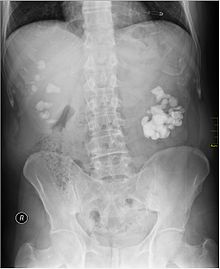 Calcium-containing stones are relatively radiodense, and they can often be detected by a traditional radiograph of the abdomen that includes the kidneys, ureters, and bladder (KUB film).[28] Some 60% of all renal stones are radiopaque.[29][30] In general, calcium phosphate stones have the greatest density, followed by calcium oxalate and magnesium ammonium phosphate stones. Cystine calculi are only faintly radiodense, while uric acid stones are usually entirely radiolucent.[31]