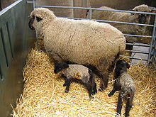 As the time for lambing approaches, the lamb will drop causing the ewe to have a swayback, exhibit restless behaviour and show a sunken appearance in front of the hipbone area.[18] When birth is imminent, contractions begin to take place, and the fitful behavior of the ewe may increase. A normal labor may take one to several hours, depending on how many lambs are present, the age of the ewe, and her physical and nutritional condition prior to the birth.[1] Though some breeds may regularly produce larger litters of lambs (records stand around nine lambs at once), most produce either single or twin lambs.[6][19] The number of lambs a ewe produces per year is known as the lambing percentage.[20] The condition of the ewe during breeding season will impact the lambing percentage as well as the size of the lambs.[21] At some point, usually at the beginning of labor or soon after the births have occurred, ewes and lambs may be confined to small lambing jugs.[7] These pens, which are generally two to eight feet (0.6 to 2.4 m) in length and width, are designed to aid both careful observation of ewes and to cement the bond between them and their lambs.[1][22]
