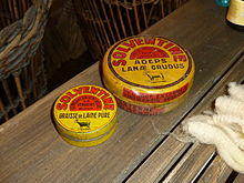 Lanolin (from Latin lāna 'wool', and oleum 'oil'), also called wool yolk, wool wax, or wool grease, is a wax secreted by the sebaceous glands of wool-bearing animals. Lanolin used by humans comes from domestic sheep breeds that are raised specifically for their wool. Historically, many pharmacopoeias have referred to lanolin as wool fat (adeps lanae); however, as lanolin lacks glycerides (glycerol esters), it is not a true fat.[1][2] Lanolin primarily consists of sterol esters instead.[3] Lanolin's waterproofing property aids sheep in shedding water from their coats. Certain breeds of sheep produce large amounts of lanolin.