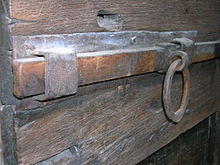 A Norfolk latch is a type of latch incorporating a simple thumb-actuated lever and commonly used to hold wooden gates and doors closed. In a Norfolk latch, the handle is fitted to a backplate independently of the thumb piece.[6] Introduced around 1800–1820, Norfolk latches, originating in the English county of the same name, differ from the older Suffolk latch, which lacked a back plate to which the thumbpiece is attached.