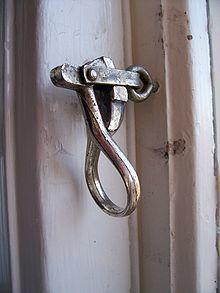 A cabin hook is a hooked bar that engages into a staple.[8][9] The bar is usually attached permanently to a ring or staple that is fixed with screws or nails to woodwork or a wall at the same level as the eye screw. The eye screw is usually screwed into the adjacent wall or onto the door itself. Used to hold a cupboard, door or gate open or shut.[10]