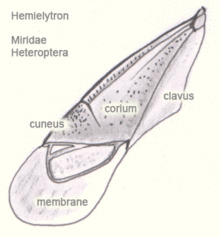 Miridae are small, terrestrial insects, usually oval-shaped or elongate and measuring less than 12 millimetres (0.5 in) in length. Many of them have a hunched look, because of the shape of the prothorax, which carries the head bent down. Some are brightly coloured and attractively patterned, others drab or dark, most being inconspicuous. Some genera are ant mimics at certain stages of life. The Miridae do not have any ocelli. Their rostrum has four segments. One useful feature in identifying members of the family is the presence of a cuneus; it is the triangular tip of the corium, the firm, horny part of the forewing, the hemelytron. The cuneus is visible in nearly all Miridae, and only in a few other Hemiptera, notably the family Anthocoridae, which are not much like the Miridae in other ways. The tarsi almost always have three segments.[2]