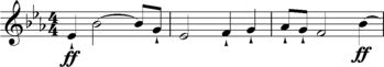 A leitmotif or leitmotiv[1] (/ˌlaɪtmoʊˈtiːf/) is a "short, recurring musical phrase"[2] associated with a particular person, place, or idea. It is closely related to the musical concepts of idée fixe or motto-theme.[3] The spelling leitmotif is an anglicization of the German Leitmotiv (IPA: [ˈlaɪtmoˌtiːf]), literally meaning "leading motif", or "guiding motif". A musical motif has been defined as a "short musical idea ... melodic, harmonic, or rhythmic, or all three",[4] a salient recurring figure, musical fragment or succession of notes that has some special importance in or is characteristic of a composition: "the smallest structural unit possessing thematic identity."[5]