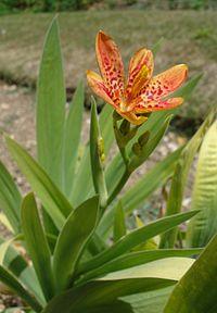 The leopard lily is a flowering perennial of Chinese origin, and is locally used in Chinese villages for its medicinal values. Currently, studies are underway to investigate its apparent potential against prostate cancer.[4] The dried rhizome has long been used in East Asia to treat throat troubles, asthma, swollen liver and spleen, gonorrhea, malaria, and arrow poisoning. The herb is a principal ingredient in a lung support formula to reduce inflammation (heat) and fight viral infection.[5]