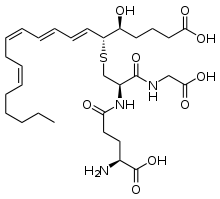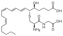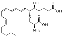 LTC4, LTD4, LTE4 and LTF4 are often called cysteinyl leukotrienes due to the presence of the amino acid cysteine in their structure. The cysteinyl leukotrienes make up the slow-reacting substance of anaphylaxis (SRS-A). LTF4, like LTD4, is a metabolite of LTC4, but, unlike LTD4, which lacks the glutamic residue of glutathione, LTF4 lacks the glycine residue of glutathione.[11]