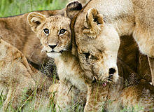 Lions typically consume prey at the location of the hunt but sometimes drag large prey into cover.[116] They tend to squabble over kills, particularly the males. Cubs suffer most when food is scarce but otherwise all pride members eat their fill, including old and crippled lions, which can live on leftovers.[91] Large kills are shared more widely among pride members.[117] An adult lioness requires an average of about 5 kg (11 lb) of meat per day while males require about 7 kg (15 lb).[118] Lions gorge themselves and eat up to 30 kg (66 lb) in one session;[81] if it is unable to consume all of the kill, it rests for a few hours before continuing to eat. On hot days, the pride retreats to shade with one or two males standing guard.[116] Lions defend their kills from scavengers such as vultures and hyenas.[91]