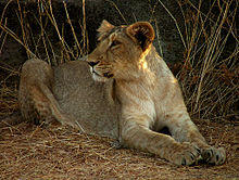 The male lion's mane is the most recognisable feature of the species.[14] It may have evolved around 320,000–190,000 years ago.[61] It starts growing when lions are about a year old. Mane colour varies and darkens with age; research shows its colour and size are influenced by environmental factors such as average ambient temperature. Mane length apparently signals fighting success in male–male relationships; darker-maned individuals may have longer reproductive lives and higher offspring survival, although they suffer in the hottest months of the year. The presence, absence, colour and size of the mane are associated with genetic precondition, sexual maturity, climate and testosterone production; the rule of thumb is that a darker, fuller mane indicates a healthier animal. In Serengeti National Park, female lions favour males with dense, dark manes as mates. Male lions usually aim for the backs or hindquarters of rivals, rather than their necks.[62][63] Cool ambient temperature in European and North American zoos may result in a heavier mane.[64] Asiatic lions usually have sparser manes than average African lions.[65]